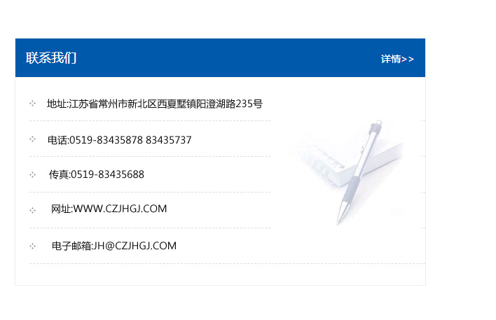 地址:常州市新北區友邦商務大廈1幢16、17層  電話:0519-85101652  傳真:0519-85112595  郵編:213022  網址:www.cz-jiayue_cn.yifanapp.com  郵箱:xiajifengaa@163.com